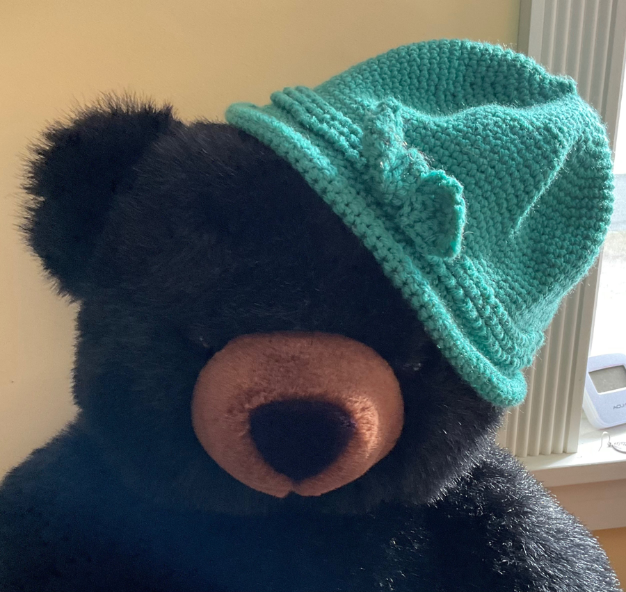 Hand knit hat in teal with knit bow. One size fits all. (Bear not included).