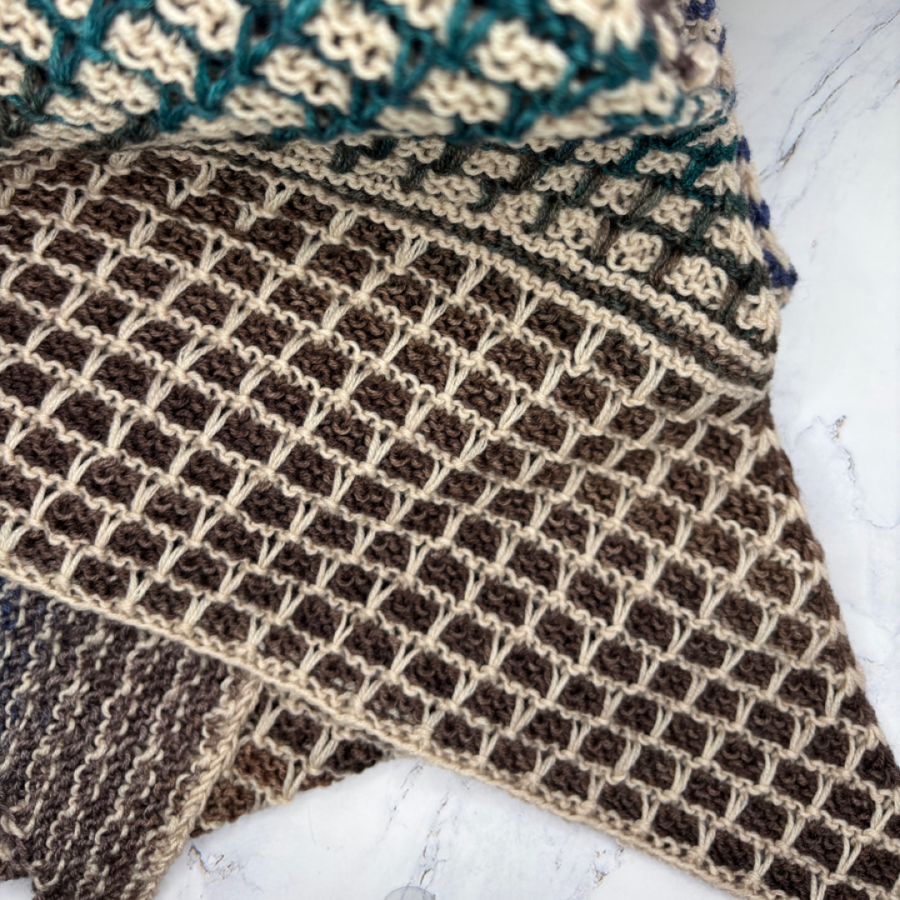 Add a dash of panache to your wardrobe with this earth toned hand knit scarf. It features pointed ends and beautiful patterning.