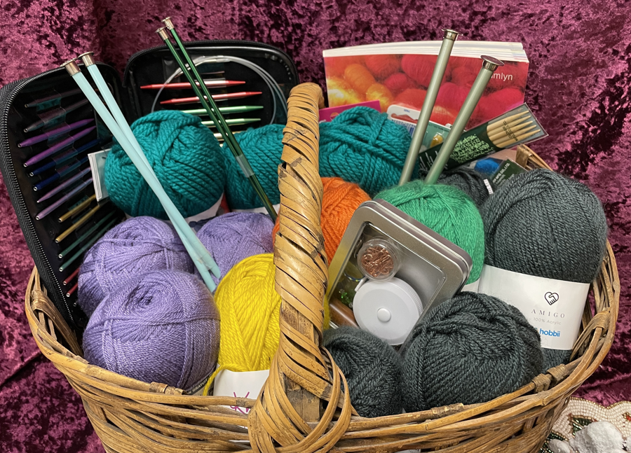 #1054 - This luxurious knitting gift set has everything a crafter could dream of. It includes a Boye Circular Needle Set, four skeins of Knit Picks yarn in vibrant greens, purples, golds, and oranges, a knitting gauge, The Knitter’s Handbook, and an assortment of knitting notions and needles. Adding a touch of elegance, the set also features a Swarovski crystal tool box—a tin box with a Swarovski crystal chatelaine complete with scissors, tape measure, a wooden needle case, and stitch markers—perfect for combining practicality with sparkle in every project. NEW & gently used / Not redeemable for cash.