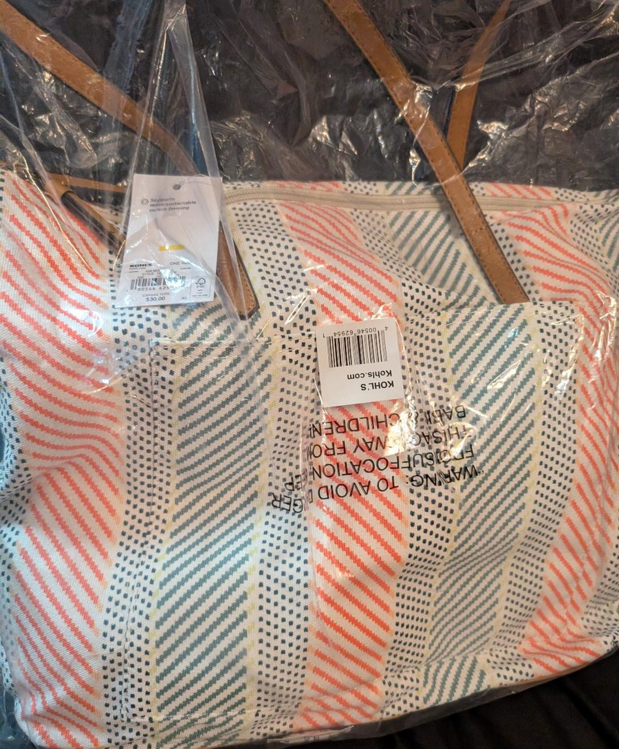 Beautiful zippered bag, plenty of room, and pockets. Colors are teal, white, and peach/pink color with leather like straps. Would make a nice spring bag with the beautiful colors.