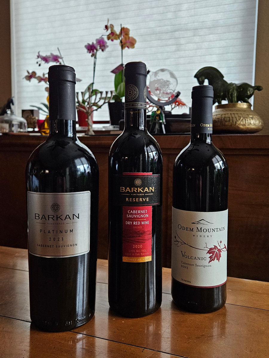 Kosher for Passover cabernet sauvignon wine basket. Includes a 2021 Barkan Platinum Cabernet Sauvignon, 2020 Barkan Reserve Cabernet Sauvignon, and 2023 Odem Mountain Volcanic Cabernet Sauvignon. All Israeli, all excellent!