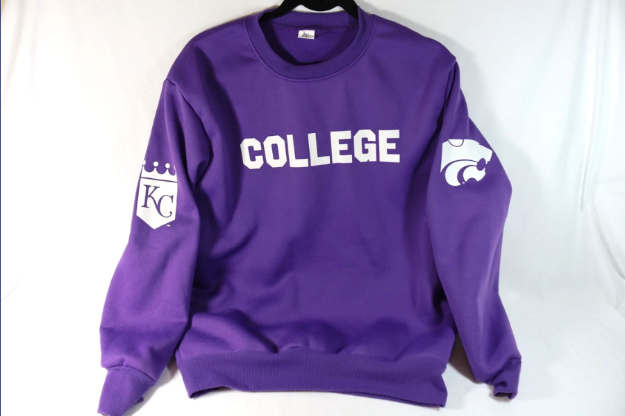 This Limited Edition “COLLEGE” crewneck is a KSU twist on the classic Animal House sweatshirt — featuring bold white text, the KC Royals crown on one sleeve and K-State’s Powercat on the other. Size: Adult M