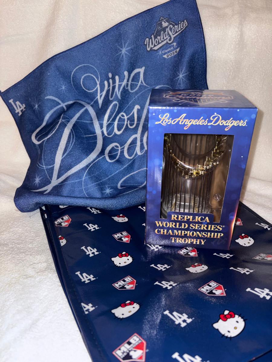 LA Dodgers Replica 2024 World Series Championship Trophy; Viva Los Dodgers 2025 World Series Rally Towel; and Hello Kitty LA Dodgers Shopping Bag