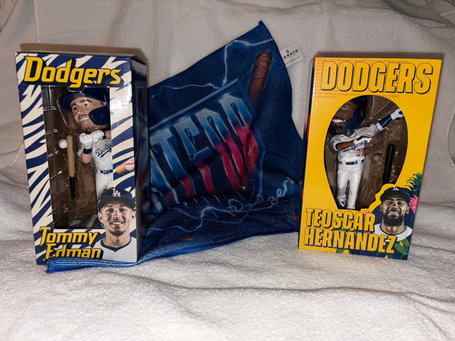 LA Dodgers Tommy Edman 2024 World Champions Bobblehead; Teoscar Hernandez 2024 World Champions Bobblehead; and #ITFDB 2025 World Series Rally Towel