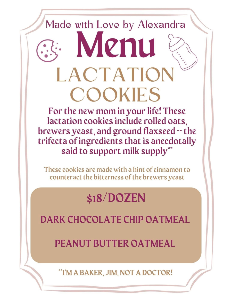 Cookies for the new mom in your life! These lactation cookies (a dozen peanut butter & a dozen chocolate chip) are made with rolled oats, brewer's yeast, and ground flaxseed - the trifecta of ingredients that is anecdotally said to support milk supply. These cookies are made with a hint of cinnamon to counteract the bitterness of brewer's yeast. Baked by Made with Love by Alexandra, these delicious cookies will stay fresh frozen through mid-July 2026.