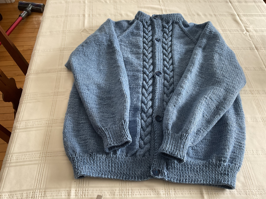 lady's medium sweater, knit from acrylic yarn, an outdoor garment for spring or fall, waterproof and washable
