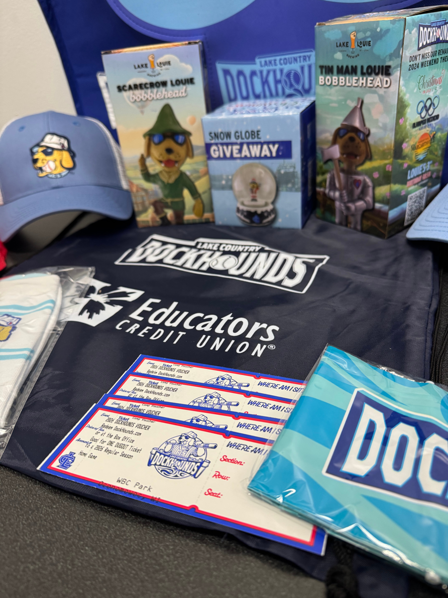 4 - Dugout Tickets for 2026 Season 4 - Lake Country DockHounds, mesh, snap-back, ball caps 1 - 2025 East Division Champs Ball Cap, mesh, snap-back 1 - DockHounds Red/White/Blue Bucket hat 1 - Christmas in July Snowglobe 1 - Tin Man Louie Bobblehead 1 - Scarecrow Louie Bobblehead 1 - Pair of DockHound Socks 1 - Set of FAN-ta-STICKS Stadium Bangers 1 - Sling Back Bag 2 - Seat Pads 1 - Foam Mustache