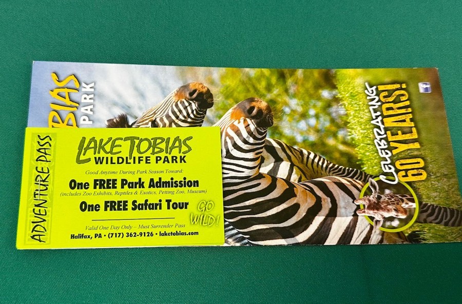 Lake Tobias Tickets (2) Includes - safari tour, park admission, zoo exhibits, retiles & exotics, petting zoom, and museum Donated by: Lake Tobias 760 Tobias Rd Halifax, PA 17032