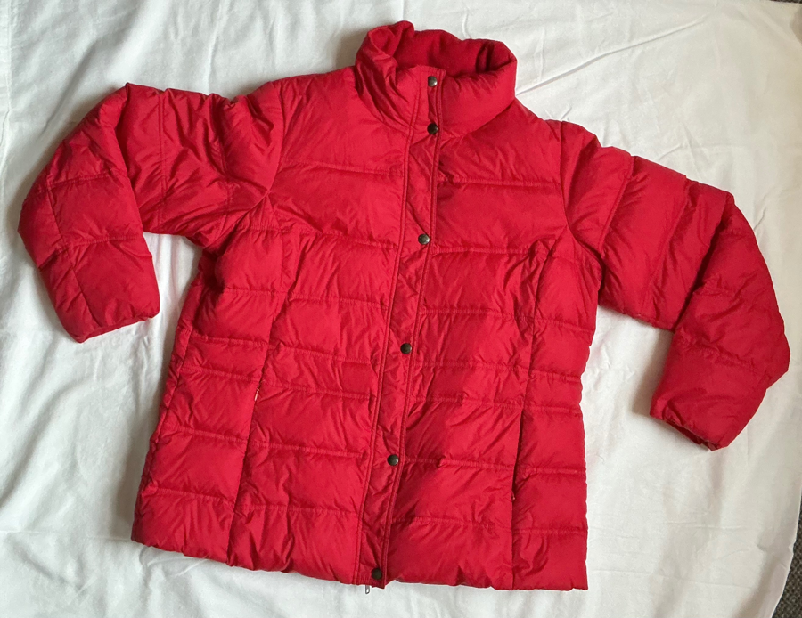 Red winter down jacket, size 1X - 16W - 18W, snap and zipper front.