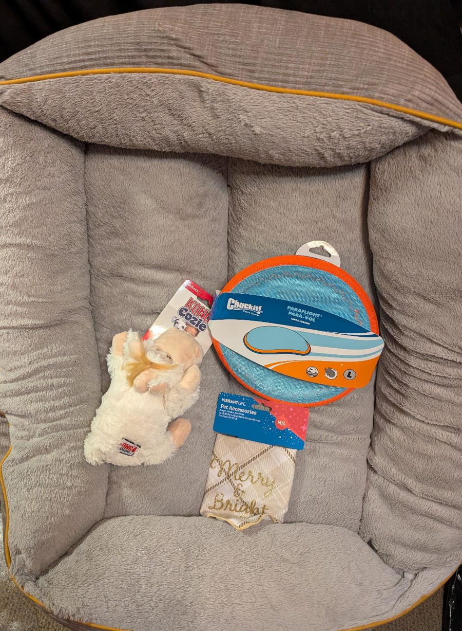 Includes a Chuck-It Floatable Frisbee, A Kong Cozie Squeak Toy, a Holiday Bandana, a Large Vibrant-Life Dog Bed: LARGE DOG BED FOR BIG BREEDS: Spacious 36" x 27" size is perfect for large dogs like Boxers, Labradors, Golden Retrievers, and other big breeds that love to stretch out or smaller dogs to snuggle in! SUPPORTIVE BOLSTER DESIGN: Raised sides provide orthopedic head and neck support, creating a cozy and secure lounging space for restful sleep. PLUSH & MODERN LOOK: Soft, luxurious sleep