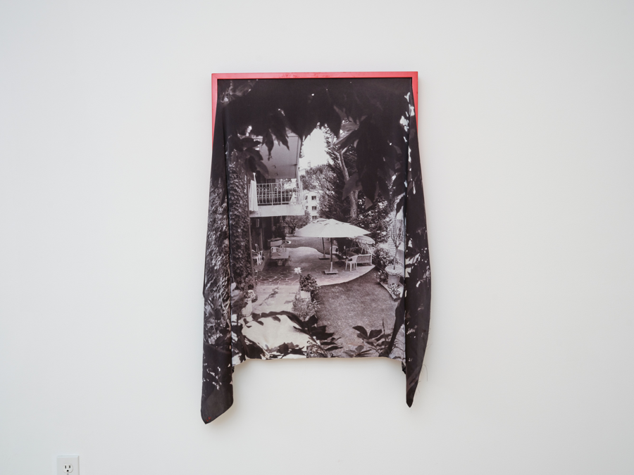 Lauren Daccache, "garden spill" Reactive dye print on mulberry silk, artist made frame 25 x 40 inches Artist Bio: Lauren Daccache (b. 1993) is a Lebanese-American visual artist raised between the US and Beirut, Lebanon and based in Cooks Falls, NY. She works between New York and Lebanon, and uses photography, sound, and installation making long-term, image-based projects that explore the impact of time and age on people and their spaces. She is currently interested in the inconsistencies and tension between personal and collective memory, and the ways in which we reconstruct the past in the absence of a complete record. Artist Statement: 'garden spill' is part of my ongoing series 'coming back is not just returning to a place'. It’s about how remembering is messy, how it's generative —how trying to hold onto a place or a feeling always turns it into something new. For those of us in the Lebanese diaspora, memory is our most precious resource: part archive, part invention, caught in a continuous loop of leaving, returning, remembering, and forgetting. This photo was taken in and of the gardens where I grew up, and it kind of spills out of the frame the way memories do—blurry around the edges, hard to contain.