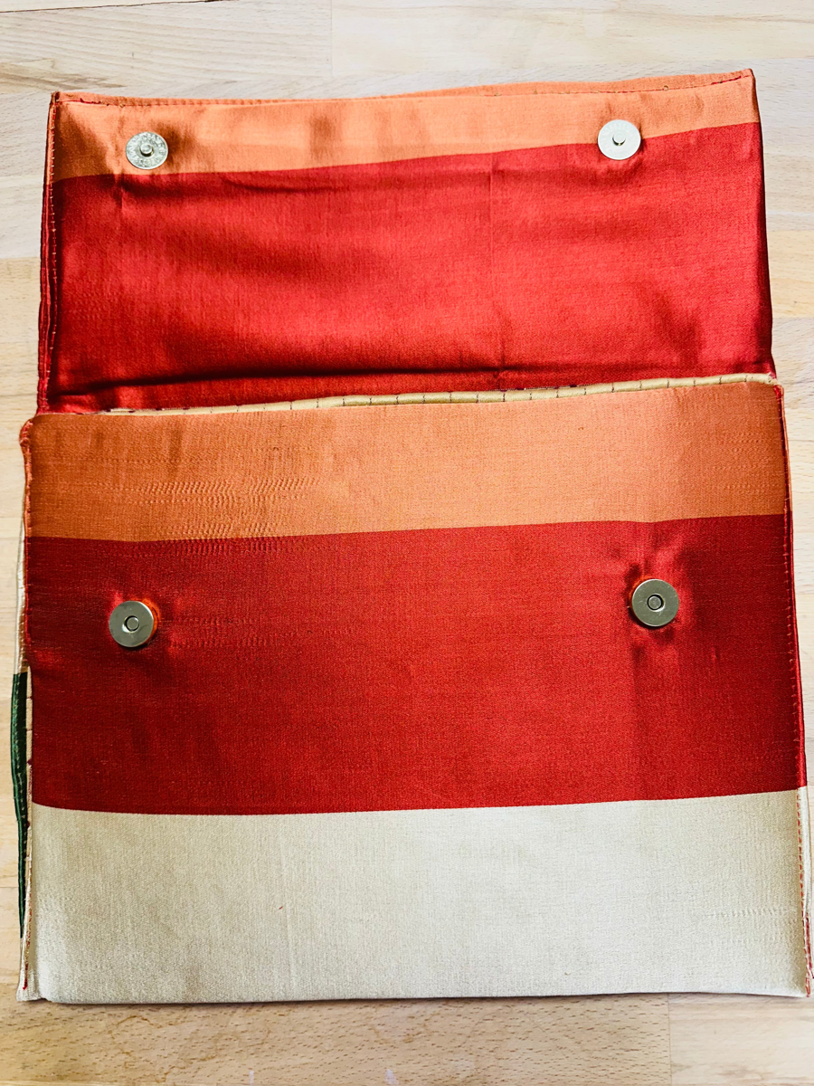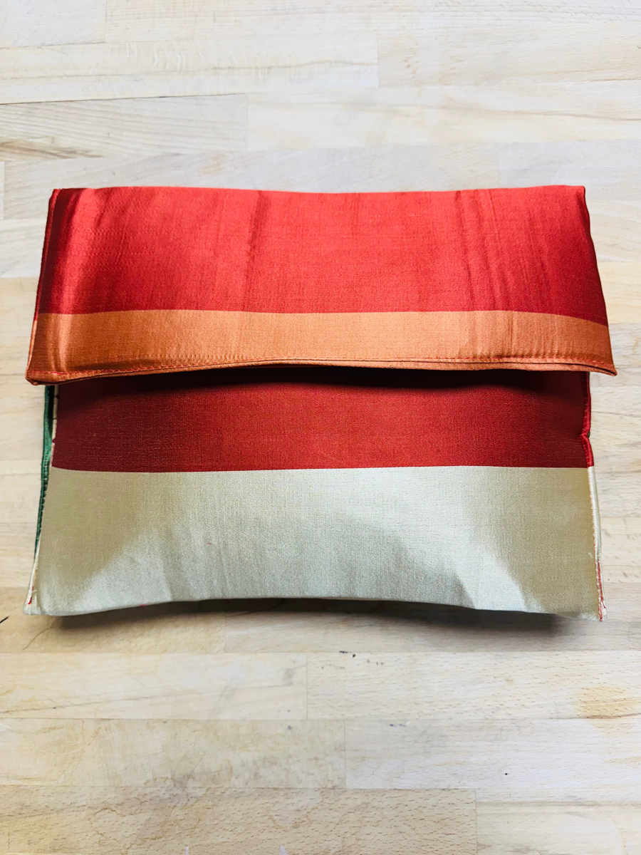 Elevate your style with this stunning, one-of-a-kind Lauren M. Clutch, thoughtfully handcrafted for both elegance and functionality. Made from 100% luxurious silk, this eye-catching piece features a rich blend of vibrant red, warm gold, and subtle multi-tonal accents that shimmer beautifully in the light.