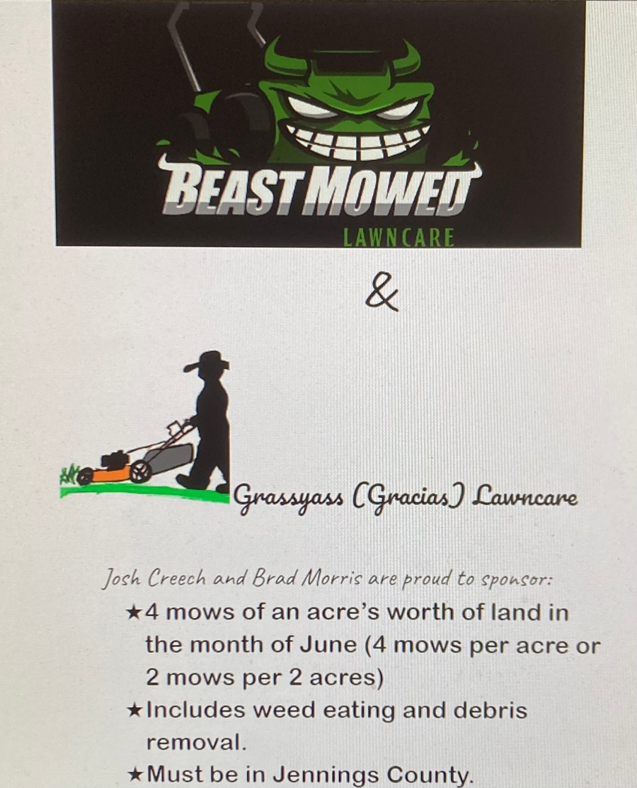 4 mows of an acre’s worth of land in the month of June (4 mows per acre or 2 mows per 2 acres) Includes weed eating and debris removal. Must be in Jennings County.