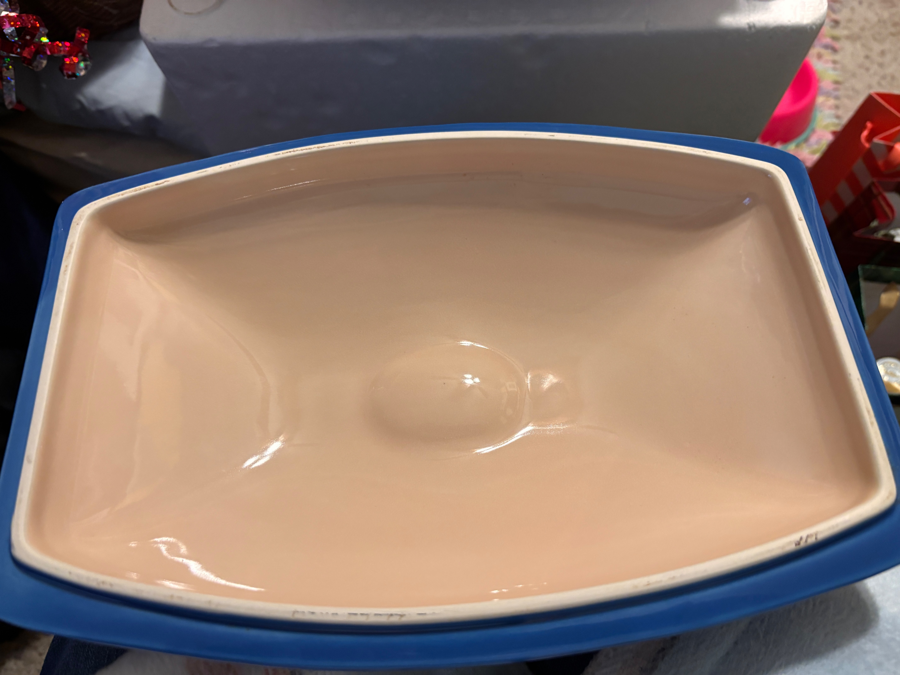 What an amazing item! Le Creuset is a premiere kitchenware maker, and this piece will not disappoint. It is new without box. Color is blue (or Marseille in Le Creuset lingo).