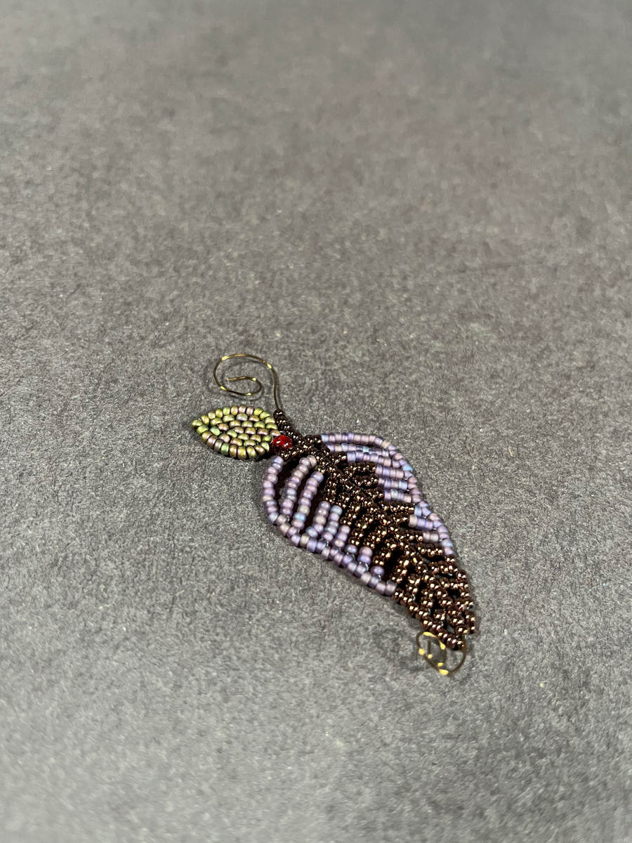 This purple and green beaded leaf features diverse beading methods and lovely work; would make a stunning ornament!