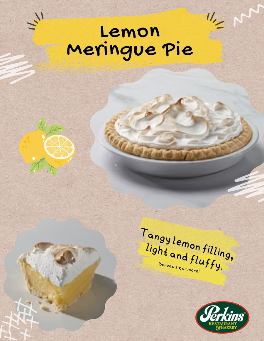 Indulge in the delightful taste of our Perkins Lemon Meringue Pie. This exquisite dessert features a perfectly baked crust filled with zesty lemon curd that strikes the ideal balance between sweet and tart. Topped with a luscious, fluffy meringue that is toasted to perfection, this pie is a true classic that promises to tantalize your taste buds. Whether you're hosting a gathering or simply treating yourself, the Perkins Lemon Meringue Pie is the perfect addition to any occasion. Don't miss the chance to savor this delicious masterpiece!