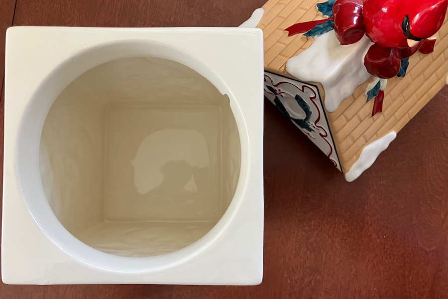 This festive figural cookie jar will bring a touch of cheer any time of the year! From the Lenox Winter Greetings collection, a male cardinal adorns the lid, which comes off to reach the goodies inside. The container portion measures approximately 4.5” square at base and 5.5” square at top. The lid is approximately 6” square. Total height is approximately 12”. Pre-owned, in very good condition.
