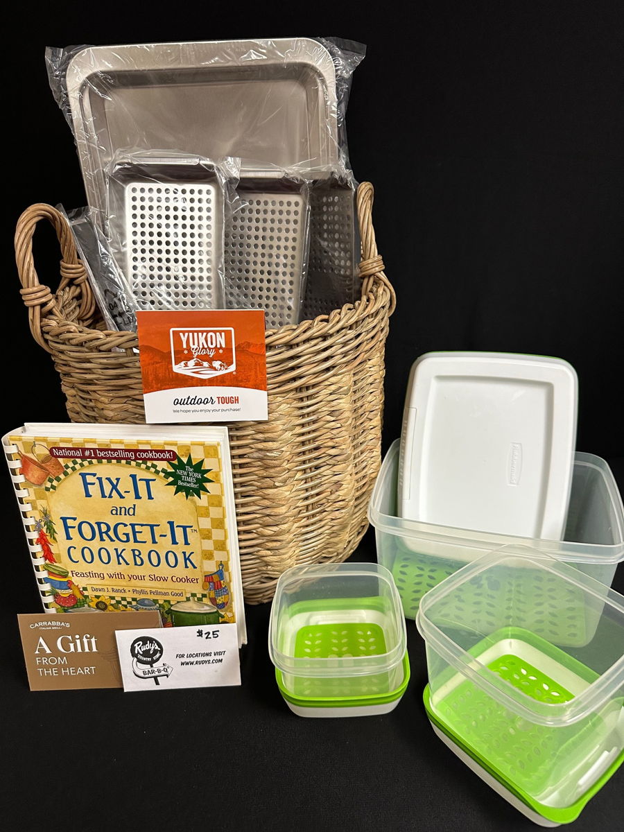 Water Hyacinth wicker basket $25 Fix-it & Forget-it cookbook $25 Set of 3 Rubbermaid produce savers $15 Yukon Glory BBQ & Serve set $60 Rudy's BBQ gift card $25 Carrabba's Italian Grill gift card $20