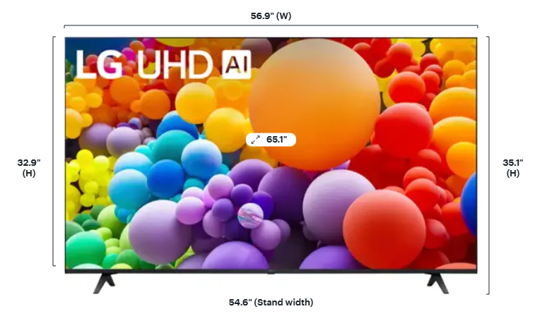Upgrade your home entertainment with this stunning 65" Smart TV. Whether you're streaming your favorite shows, watching the big game, or hosting movie night, this sleek screen delivers crystal-clear visuals and immersive sound. Details: LG - 65” Class UT75 Series LED 4K UHD Smart webOS TV Bring home 4K resolution in an impressive range of screen sizes with LG UHD TVs. Enjoy swift, easy browsing and tons of personalized recommendations including 300+ free LG channels you can't get anywhere else. Spend less time searching and more time streaming with LG webOS 24. Focus on the screen with a slim and simple-to-mount design for a stylish view no matter where you hang it. For gamers, you can quickly customize your gaming experience in one location with the LG Game Optimizer. And, with GeForce NOW included, you can automatically stream and get in the game.