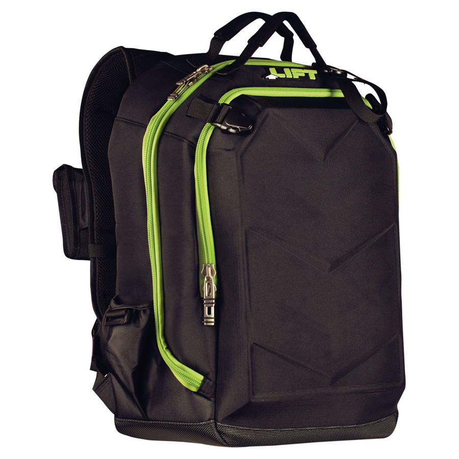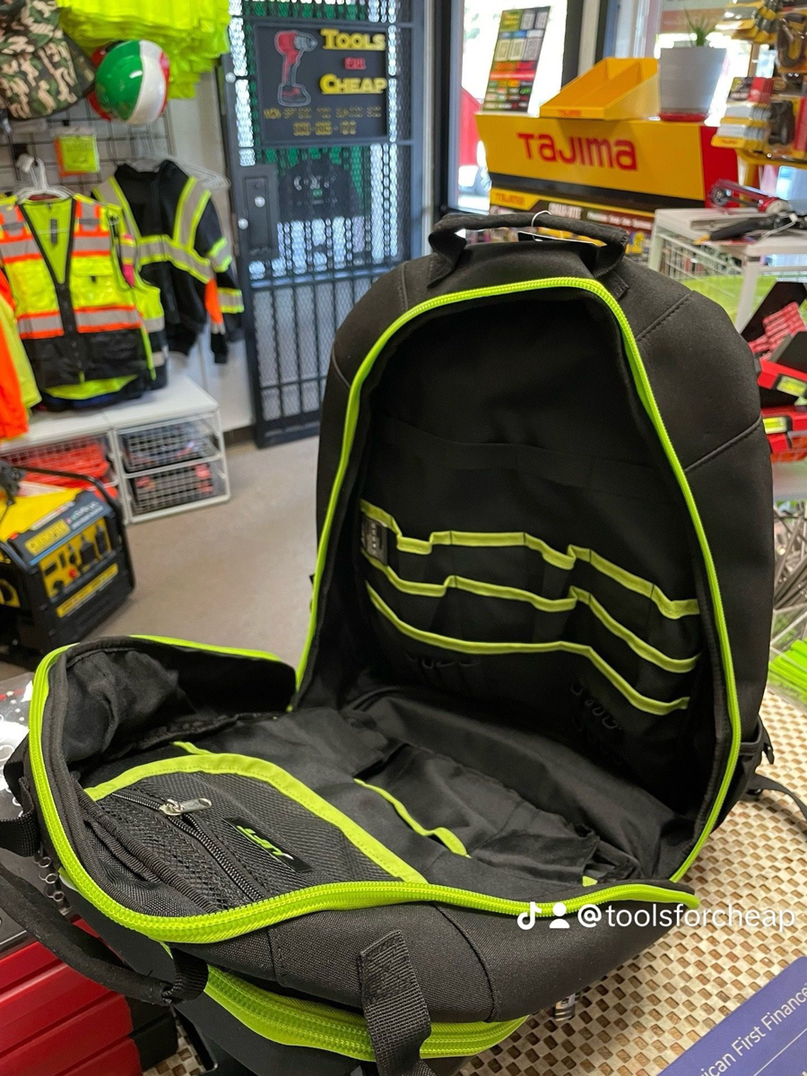 Our tool Backpack offers 29 pockets and a durable polyurethane base. The durable ballistic nylon shell stands up to any environment. • Ballistic nylon shell with reinforced stitching • Durable molded front shell • Engineered polyurethane high abrasion resistant base material • 29 pockets with cell phone holder • Curved zipper for easy access • Padded shoulder and back for comfort