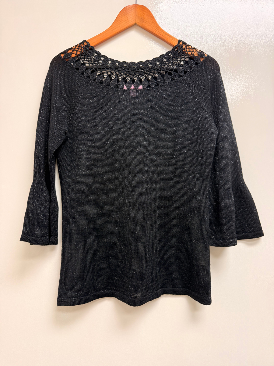 Lilly Pulitzer Barrington sweater in black shimmer with bell sleeves and a lace collar. There is no wear evident on the lace. The sweater is light-weight making it great for multi-seasonal use. Black is always flattering!