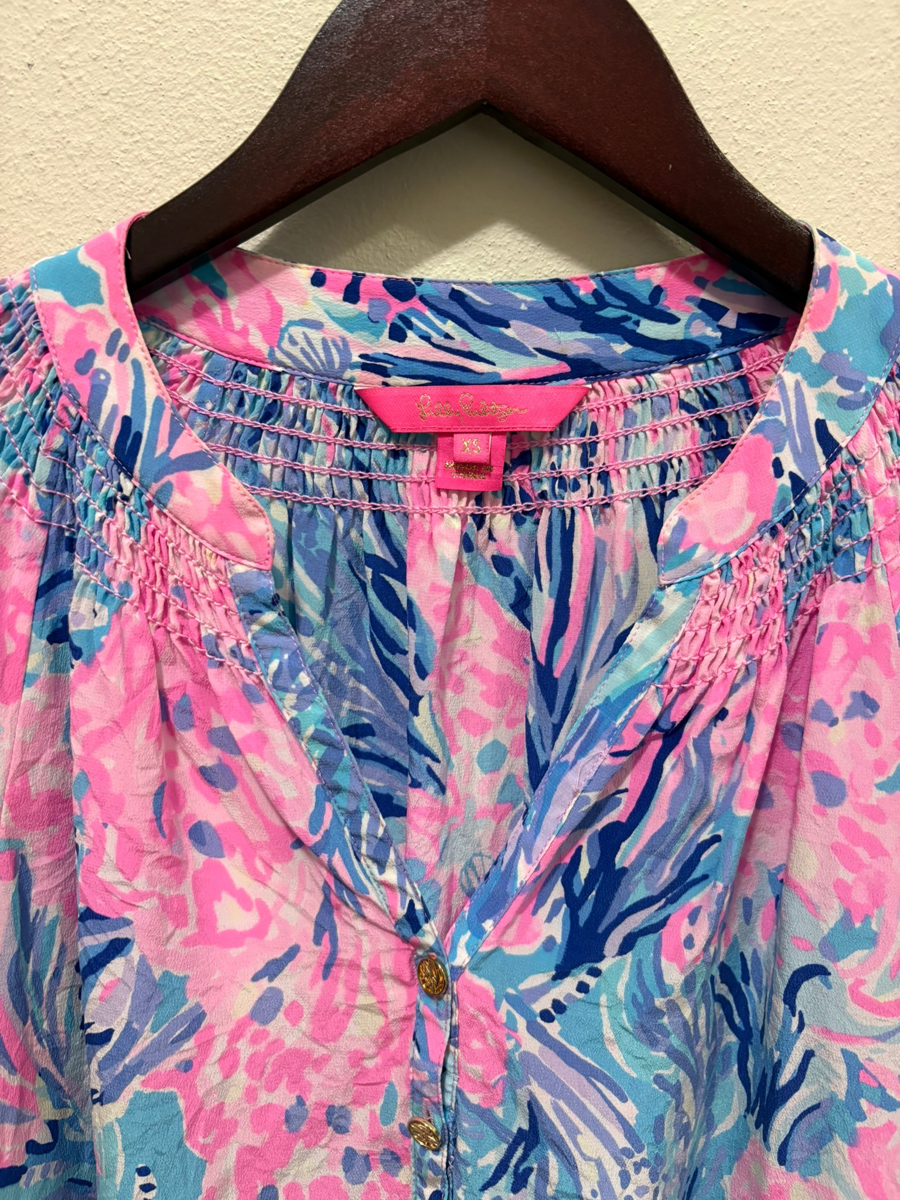 Lilly Pulitzer Elsa Silk Top is a fashionable long sleeve, loose fitting smocked V-neck blouse. It has a four button front with balloon sleeves which are elasticized at the wrist.