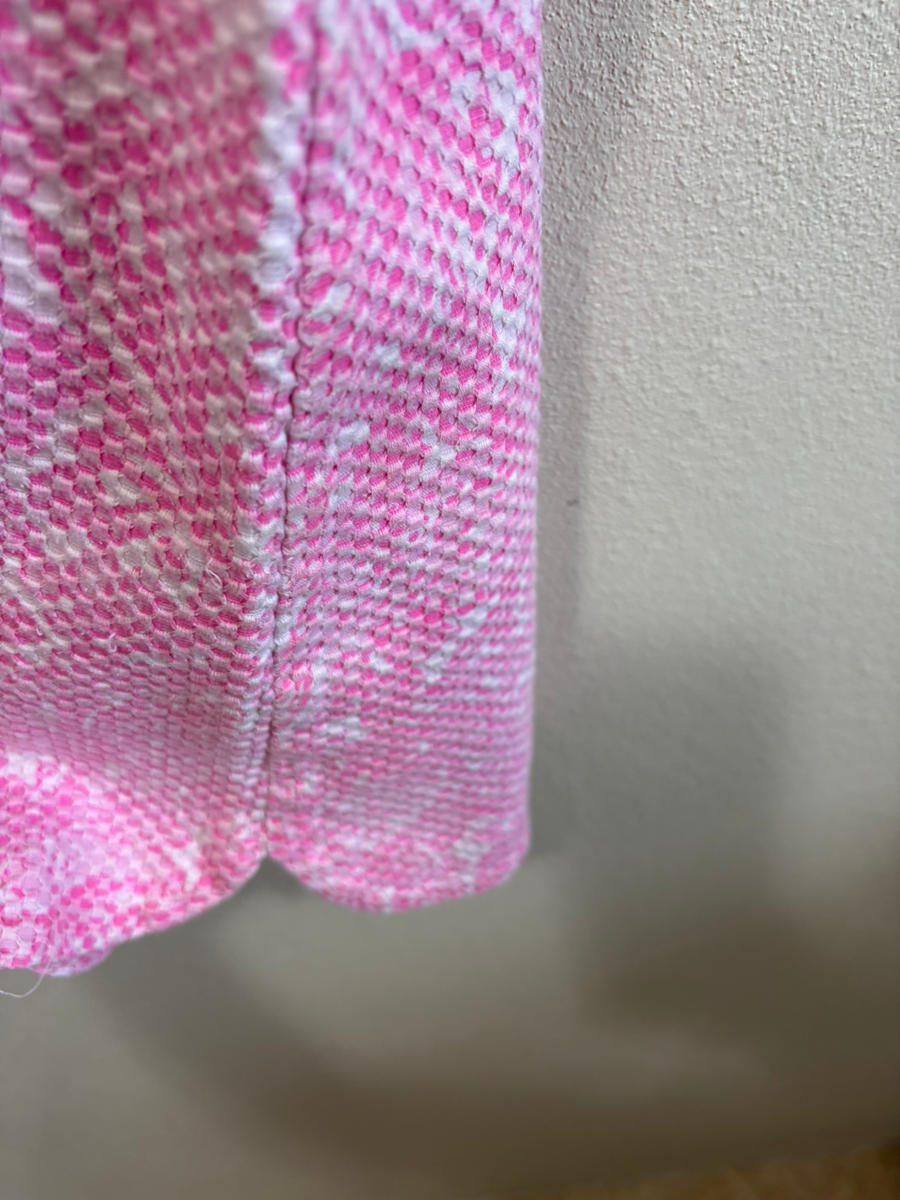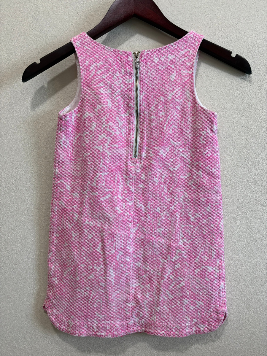 This is a Lilly Pulitzer for Target Pink Shift Dress for girls. It has a vibrant pink middle section and is knee-length with a white lining and back zipper.