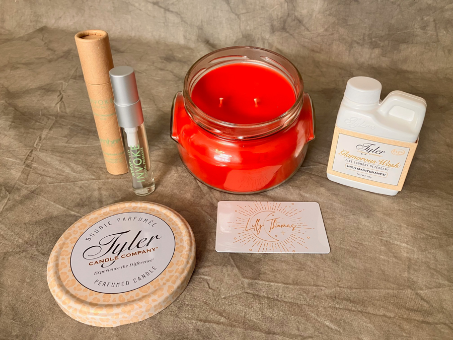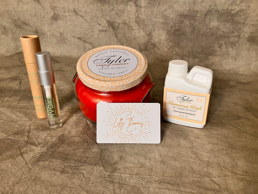 Gift Basket and Gift Card from Lilly Thomas Boutique located on the square in downtown Hickory, NC. Contains a $25 shopping gift card, 22 oz. Tyler Candle in scent, Red Carpet; 4 oz. bottle of High Maintenance Glamourous Wash and 12 ml. bottle of Invoke Pure Essential Oil Fragrance.