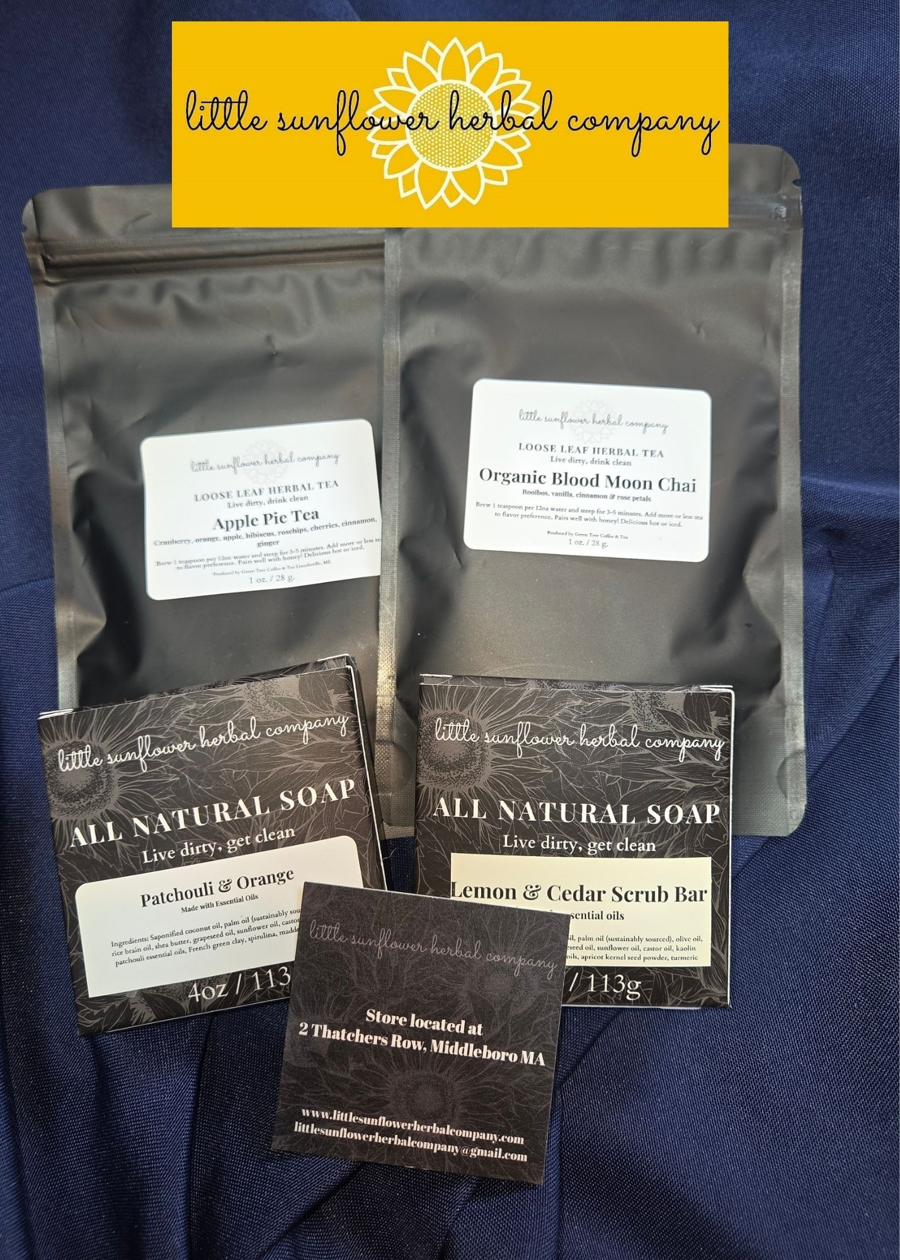 This gift bag from Little Sunflower Herbal Company includes a 1 oz. packet of Apple Pie loose leaf herbal tea, a 1 oz. packet of Organic Blood Moon Chai loose leaf herbal tea, a 4 oz. bar of Patchouli & Orange all natural soap, and a Lemon & Cedar Scrub Bar, also 4 oz.