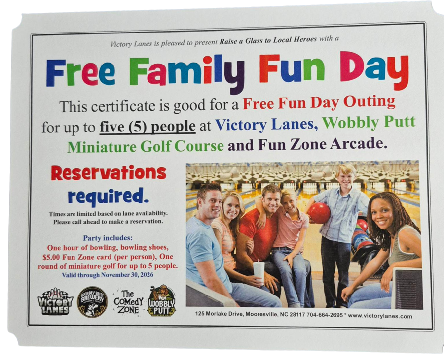 - A Family Fun Day for 5 people at Victory Lane Bowling!