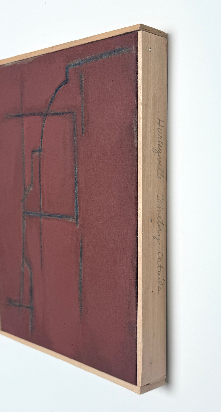 Lizzie Wright, "Hurleyville Cemetary Detail" Oil and crayon on linen 9.5 x 12.5 inches Artist Bio: Lizzie Wright is a sculptor and painter who lives and works in NYC and the Catskills. She received an MFA in Sculpture from Yale University and has exhibited at a variety of spaces including Catskill Art Space, Mindy Solomon, Halsey McKay, Marinaro, Rawson Projects, Essex Flowers and Nicelle Beauchene. Her work has been reviewed by various publications including The Brooklyn Rail and The New Yorker. Artist Statement: To make my grave-based oil paintings, sized canvas is draped over headstones and the edges of the fabric are rubbed with oil or wax medium. Back in the studio, a layer of paint is applied and wiped off, revealing the image, which appears a bit like developing a film photograph. These paintings probe historical remnants as they also explore human connections, in this case by place of burial.