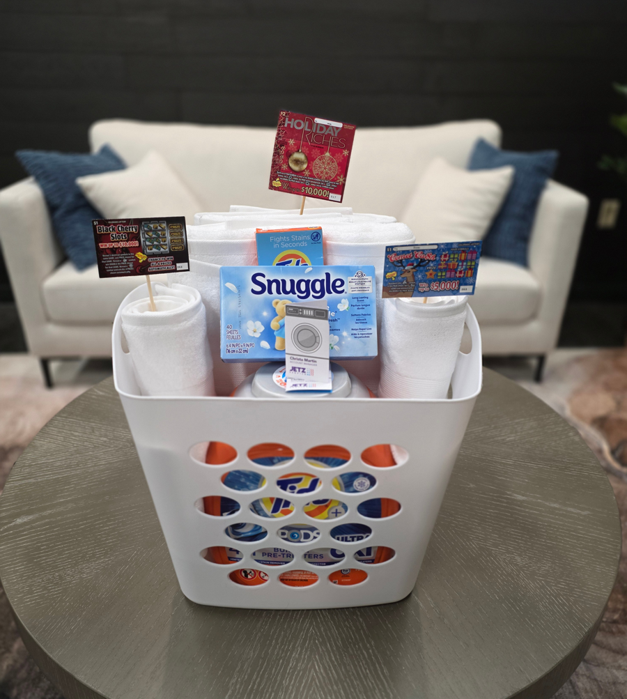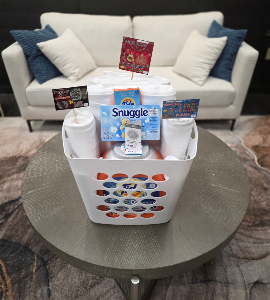 Turn laundry day into a breeze with this Laundry Supply Basket! It’s stocked with Tide Pods, Snuggle dryer sheets, Tide To-Go wipes, and a set of fresh white towels — plus three scratch tickets for a little extra excitement while the spin cycle runs. Smells like clean clothes, soft towels, and maybe even a lucky win!