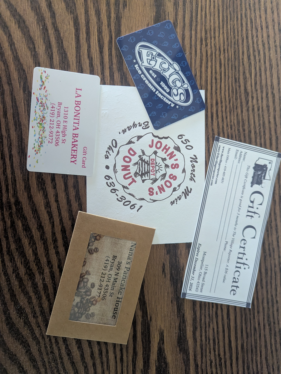 This item includes a $20 gift card to Nana's Pancake House, $20 to Eric's Ice Cream, $10 to La Bonita, a dozen mixed donuts for John's Son's Donuts, and a 3-month subscription to the Village Reporter. (1 of 2)