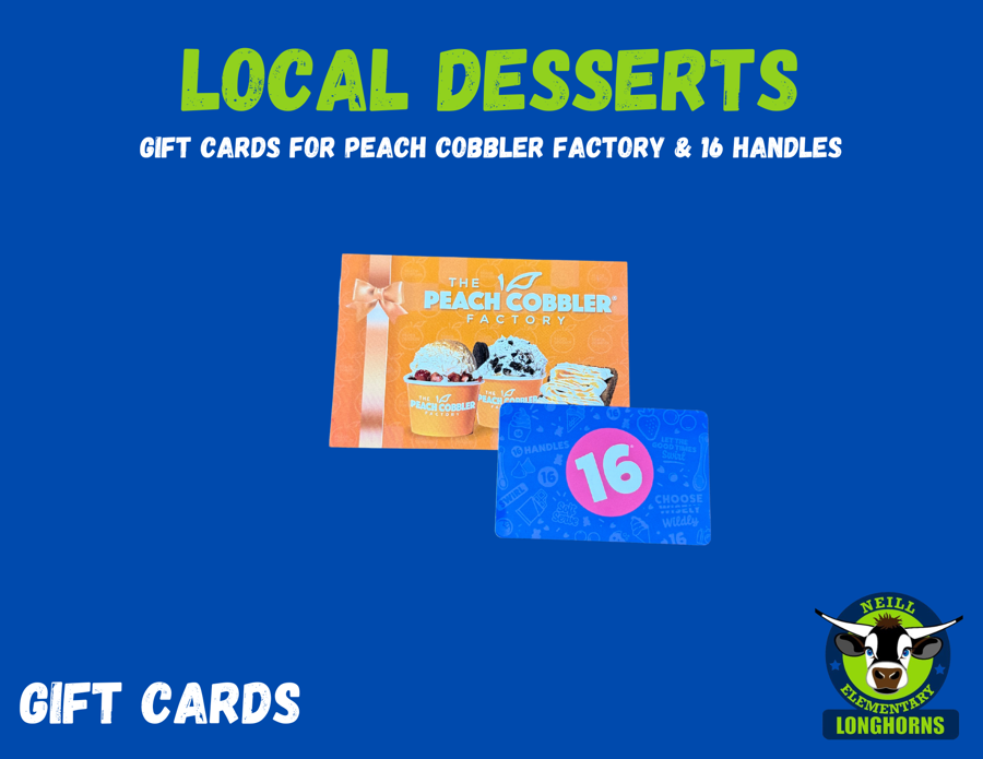 Enjoy gift cards to local favorite desserts: The Peach Cobbler Factory ($25) and 16 Handles ($10)