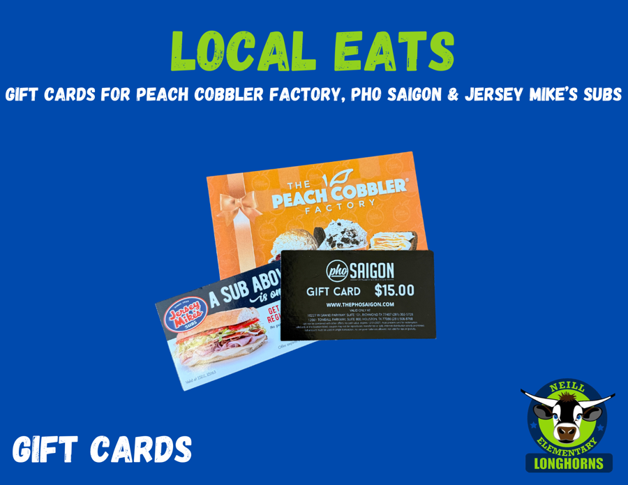 Enjoy gift cards to some local favorites: The Peach Cobbler Factory ($25), Pho Saigon ($15) and Jersey Mikes (Free Regular Sub)