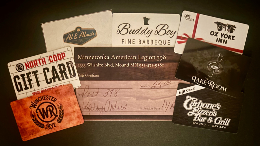 LOCAL FOODIES GIFT CARD COLLECTION: Includes: Al & Alma`s $100 GC (donated from Edward Jones-Paul Affeldt), The Lake Room/The Narrows $100 GC (donated from Kristin & John Beise REMAX Advantage Plus), Winchester & Rye in Victoria $100 GC (donated by Mid-Country Bank), Carbone`s Pizzeria Bar & Grill $25 GC, North Coop $25 GC, American Legion 398, Mound, $25 GC, Ox Yoke Inn $50 GC (donated by Rod Burriss-CrossCountry Mortgage) and Buddy Boy`s $25 GC