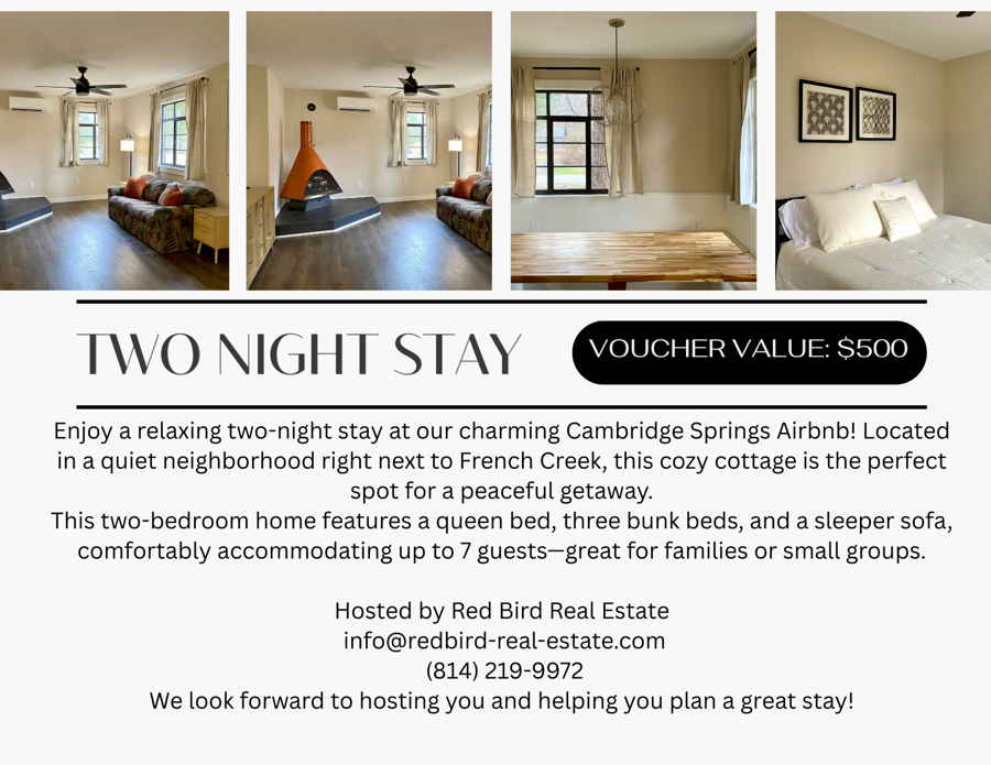 Getaway without going far! Enjoy a relaxing two-night stay at a charming Cambridge Springs Airbnb thanks to Redbird Real Estate - lovely TLC family the Gillettes! Located in a quiet neighborhood right next to French Creek, this cozy cottage is the perfect spot for a peaceful getaway. This two-bedroom home features a queen bed, three bunk beds, and a sleeper sofa, comfortably accommodating up to 7 guests—great for families or small groups.