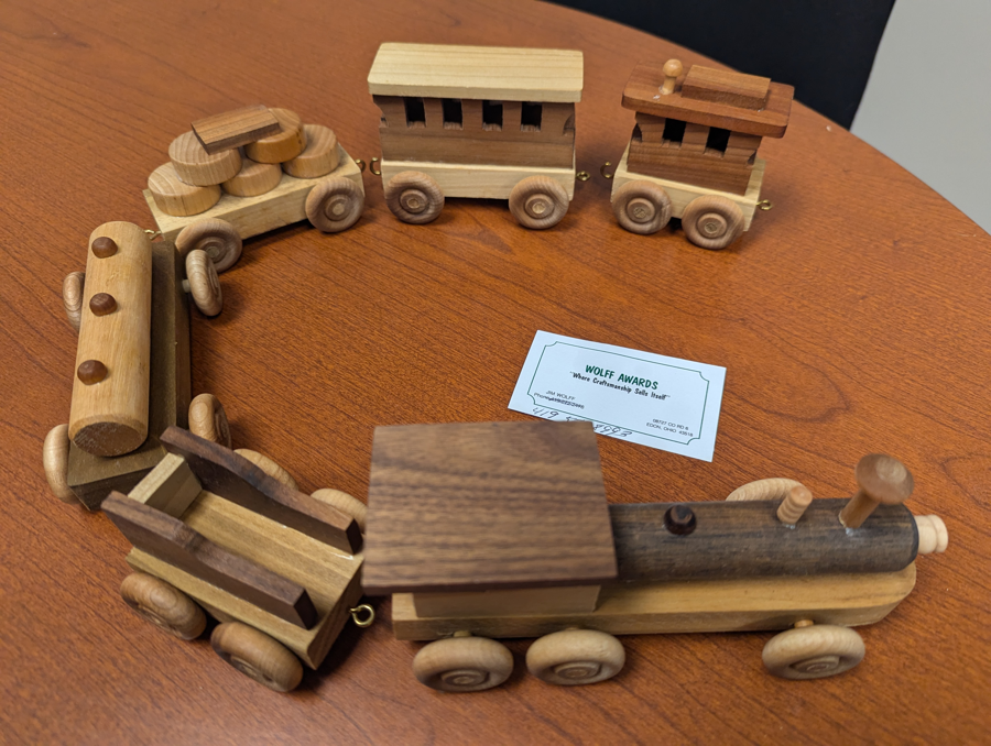 This item is a locally crafted 6-piece wooden train by Jim Wolff