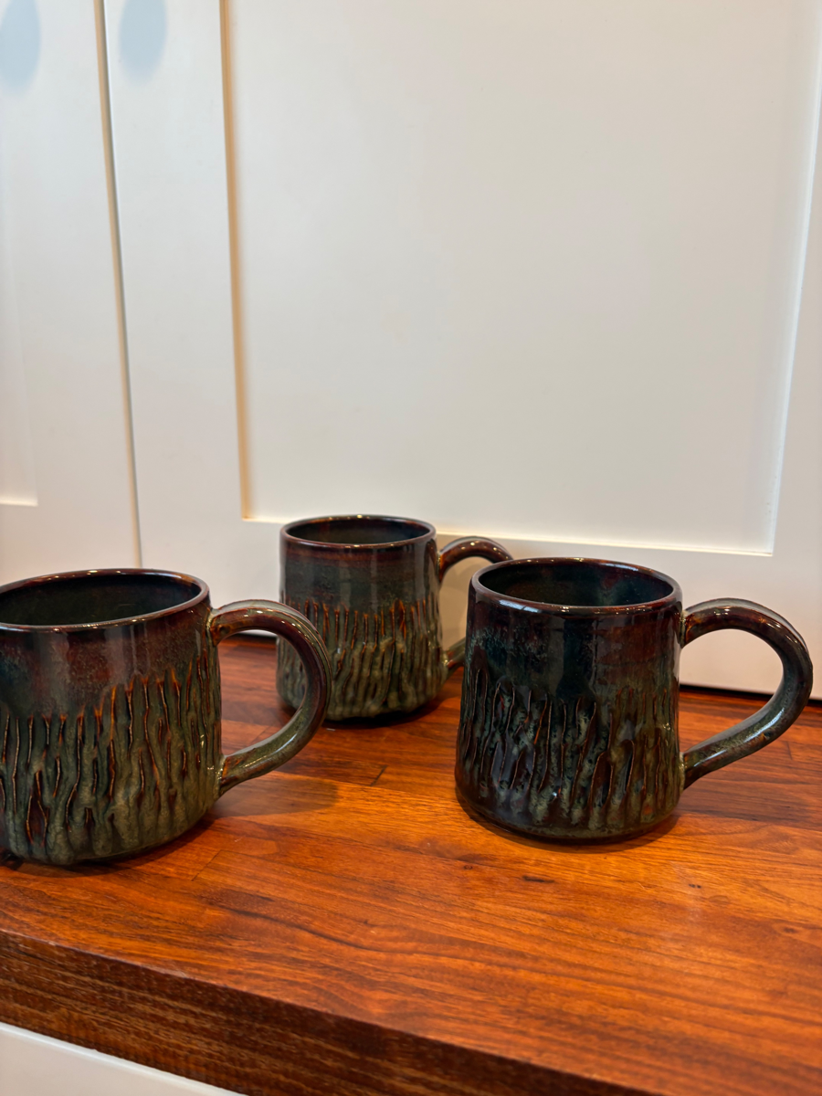 Three dishwasher-safe unique ceramic mugs. Don't miss your chance to own a piece of functional art while supporting a great cause