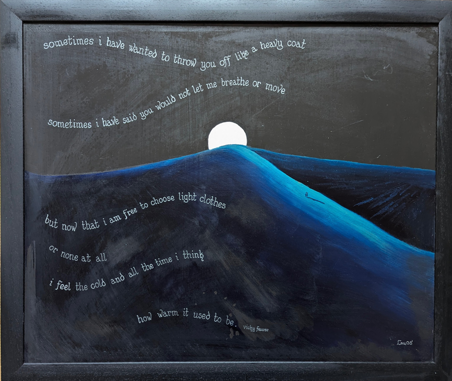 Title `Loneliness` - oil on board byLouise O Loughlin, 69.5cm across x 65cm deep (incl simple dark brown frame). Multi-coloured background with a poem by Stevie Smith in gold ink