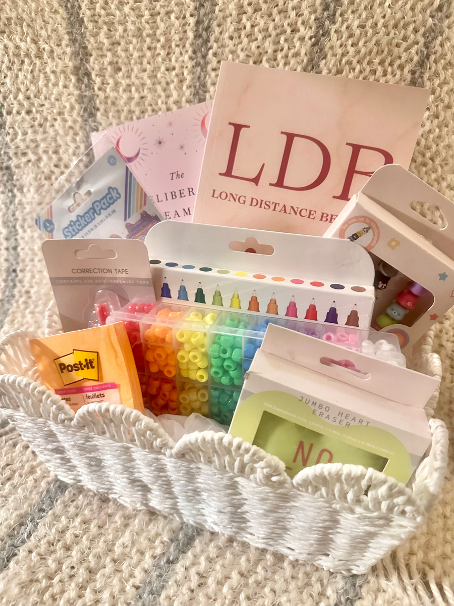 Donated By: Long Distance Besties (LDB) Give the gift of connection, creativity, and cozy self-reflection with this beautifully curated LDB journaling basket. Designed to inspire mindfulness and deepen relationships, this bundle includes the signature LDB Journal — a guided keepsake created to help best friends stay close no matter the distance. With thoughtful prompts, memory pages, and space for honest reflection, it’s the perfect way to strengthen your bond from afar. Paired with colorful writing tools, stickers, and all the journaling essentials, this basket is a feel-good treat for yourself or someone you love. 💛 ✨ Includes: The Long Distance Besties Journal — a guided, connection-focused journal for best friends navigating long distance Prompted Journal — filled with random, reflective prompts Watercolor pens Highlighters Jumbo eraser Sticker pack Post-it notes Correction tape Retail Value: $40 *Item can be picked up at the event or shipped to the winner.*