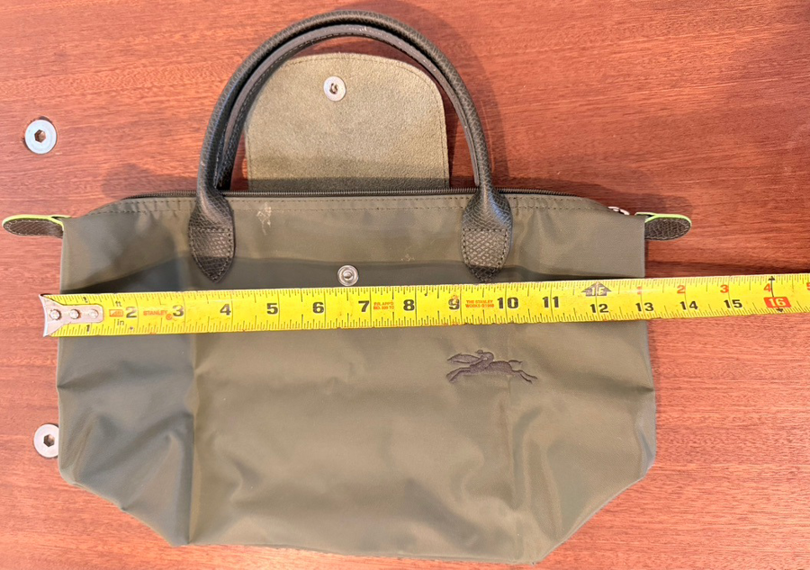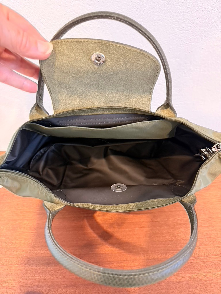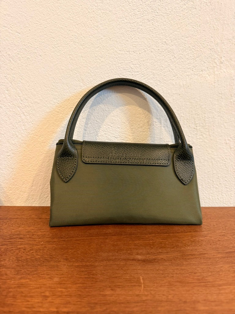 Now trending! Olive green fold over top with press-stud fastening, top zip fastening with two rolled handles. Embossed logo on the front. Main compartment with an internal pocket. Condition: Excellent: Very little wear on bag. Inside has no rips and is clean. Size: 13 inches across