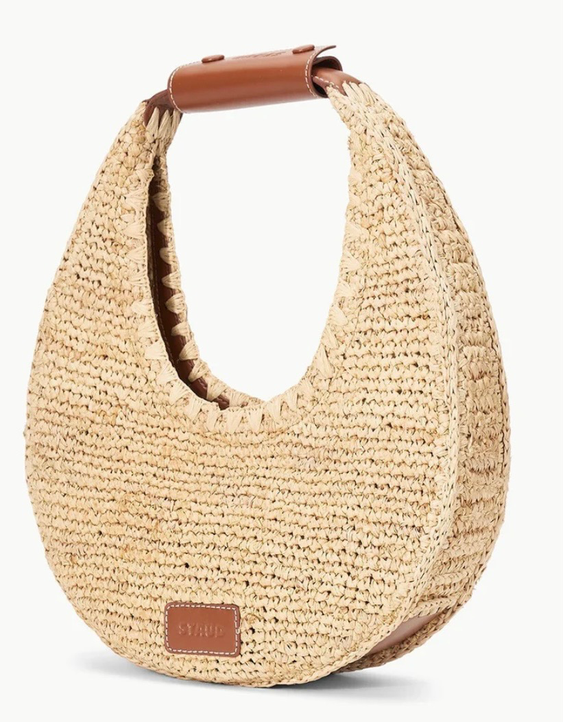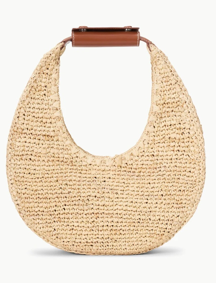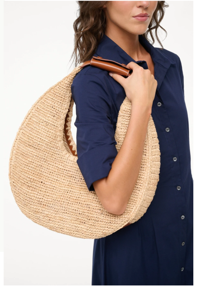 THIS NATURAL RAFFIA MOON BAG IS PERFECT!!! FOR YOUR BEACH VACATION…OR JUST LUNCH WITH THE GIRLS! LOVE THE SHAPE!! MAGNETIC CLOSURE, UNLINED. 100% NATURAL RAFFIA; TRIM: 100% COW LEATHER.
