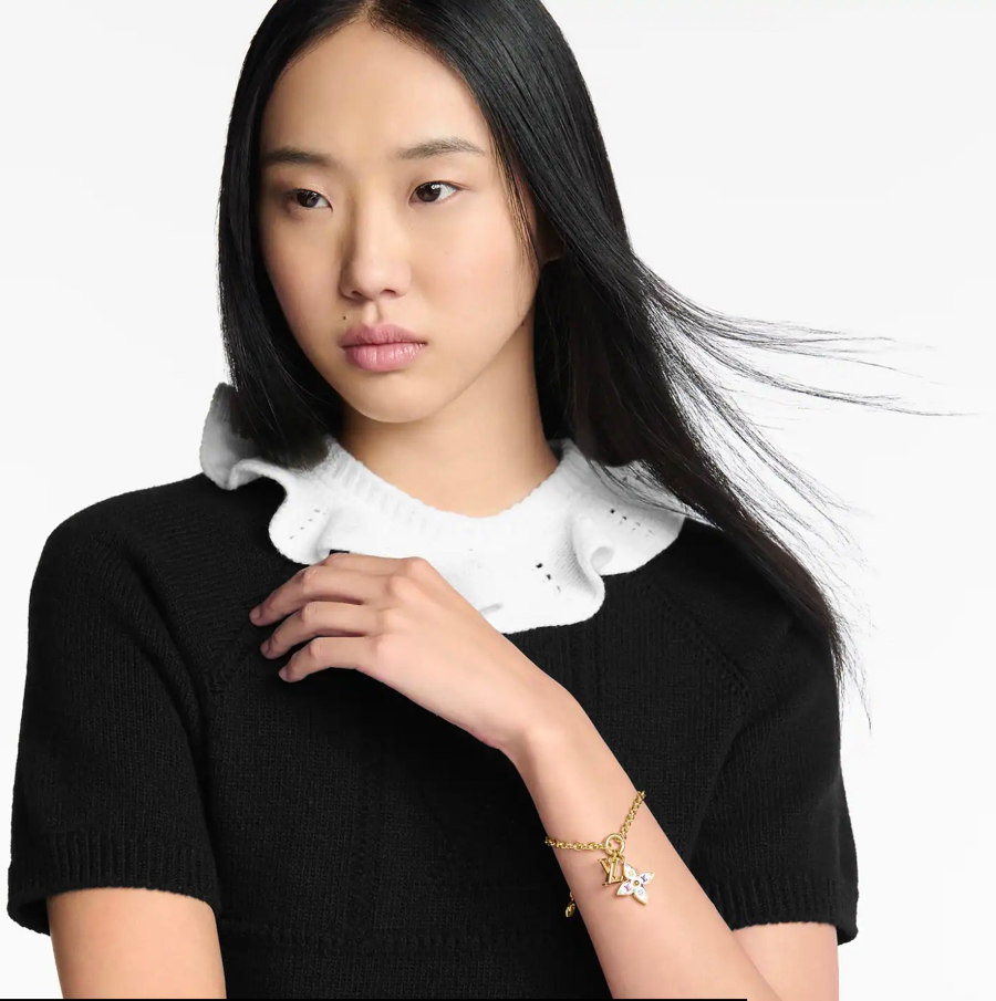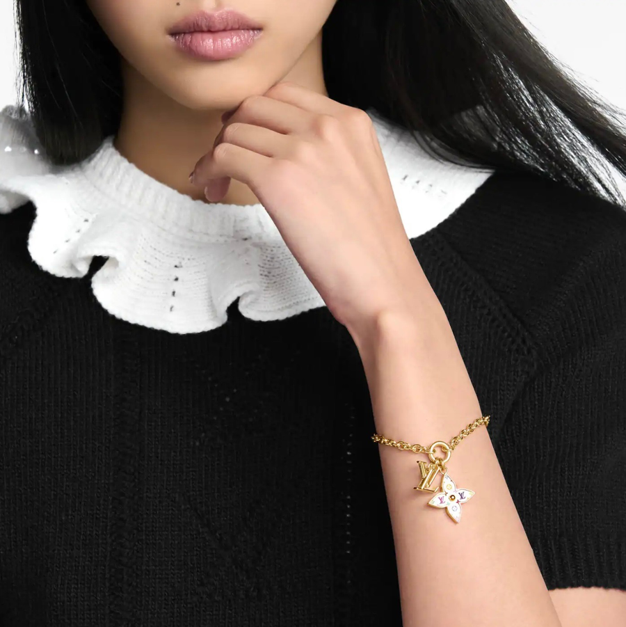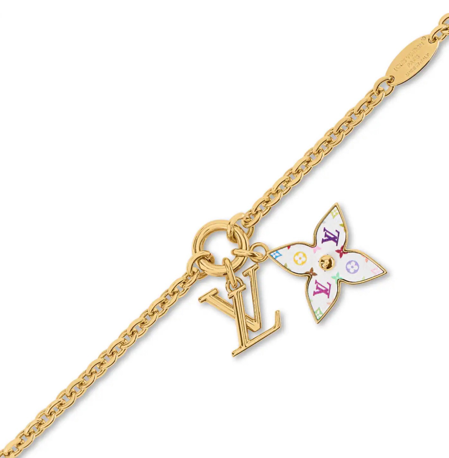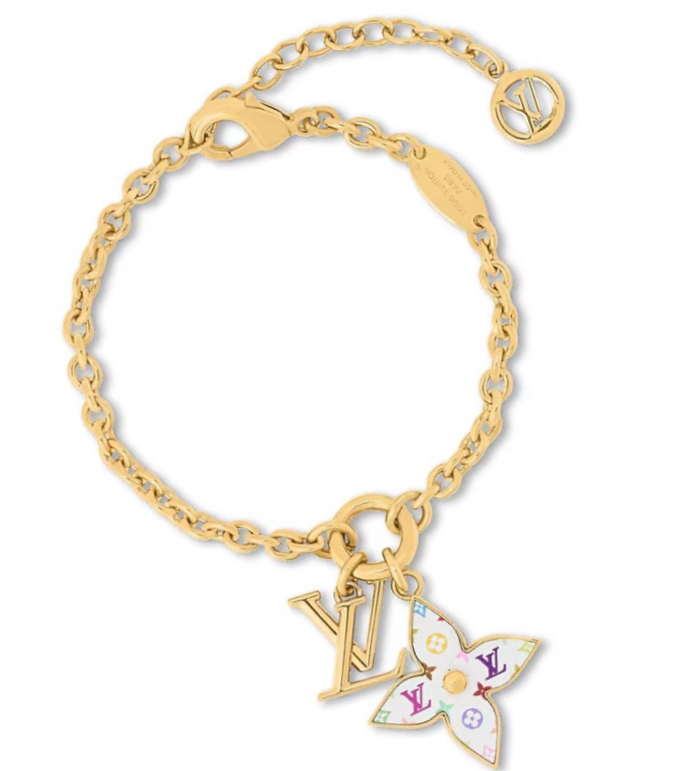 SHINY LITTLE LV HAPPY!! A CREATIVE VARIATION ON A HOUSE ICON. THIS MONOGRAM MULTICOLOR BRACELET WITH GOLD-TONED CHAIN HOLDS A MONOGRAM FLOWER CHARM ENLIVENED WITH A PLAYFUL TAKE ON THE MONOGRAM MOTIF, PLUS A COLORFUL LV INITIALS EMBLEM. ADJUSTABLE CHAIN, WITH LV CIRCLE CHARM, MULTICOLORED TOILE, SIGNATURE DETAILS.