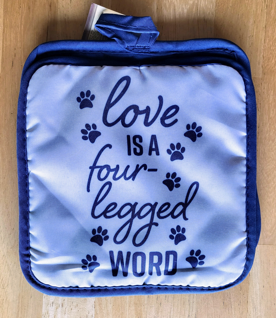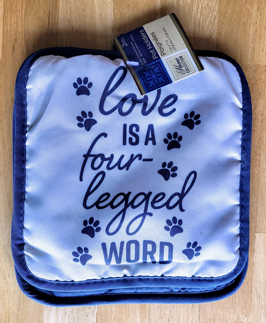 Show your feelings toward pets with this pair of light grey and navy blue potholders, with pawprint accents. These would match PURRfectly with the kitchen towel and placemats bearing the same sentiment in this auction!