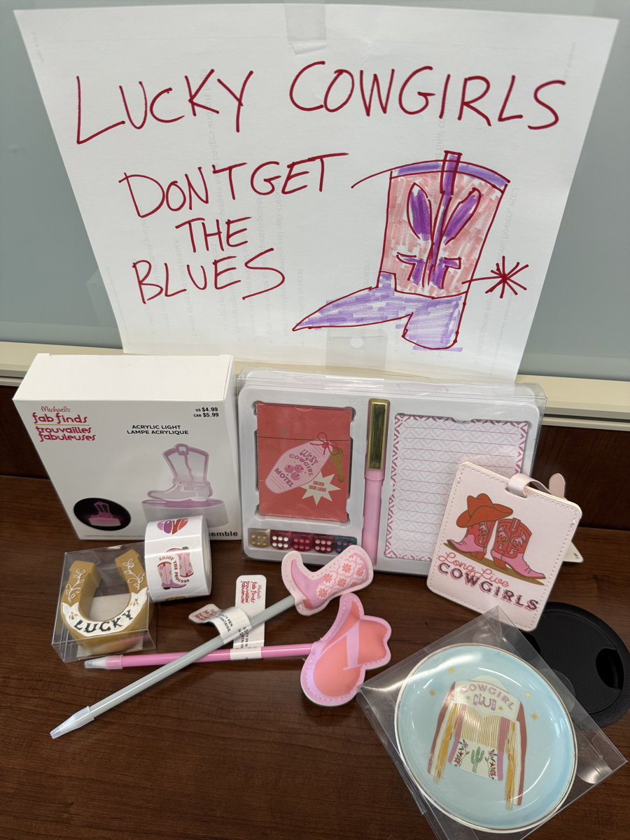 Lucky Cowgirl themed set includes: Lucky Cowgirl card set, light up boot, lucky horse shoe card holder, pens & stickers, Cowgirl luggage tag, Cowgirl jewelry catcher. Also includes priceless "Lucky Cowgirl" art piece by April Leake who will sign and personalize the boot just for you! (Warning: art piece might be on scratch paper and created with sharpies and highlighters)
