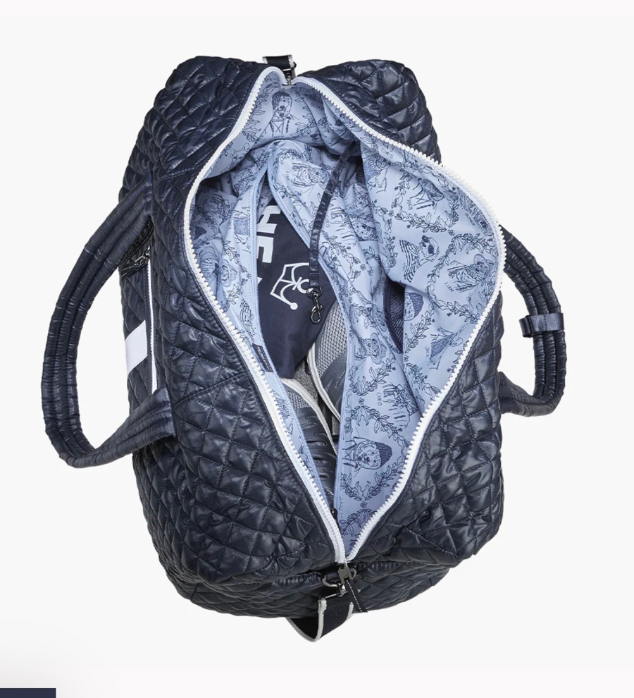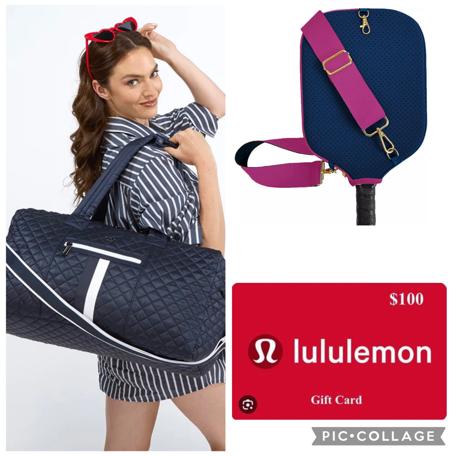 YOU WILL BE LOOKING GOOD WHEN YOU HIT THE COURT WITH THIS TRIFECTA PACKAGE… $100 LULU GIFT CARD, POSH PICKLER QUILTED DOWN-LIKE DUFFLE WITH ZIPPER POCKET, 2 LARGE SIDE POCKETS & POCKETS GALORE INSIDE AND…A STYLISH POSH PICKLER CROSSBODY PADDLE COVER WITH ZIPPERED STORAGE POUCH. DIMENSIONS ARE APPROXIMATE.