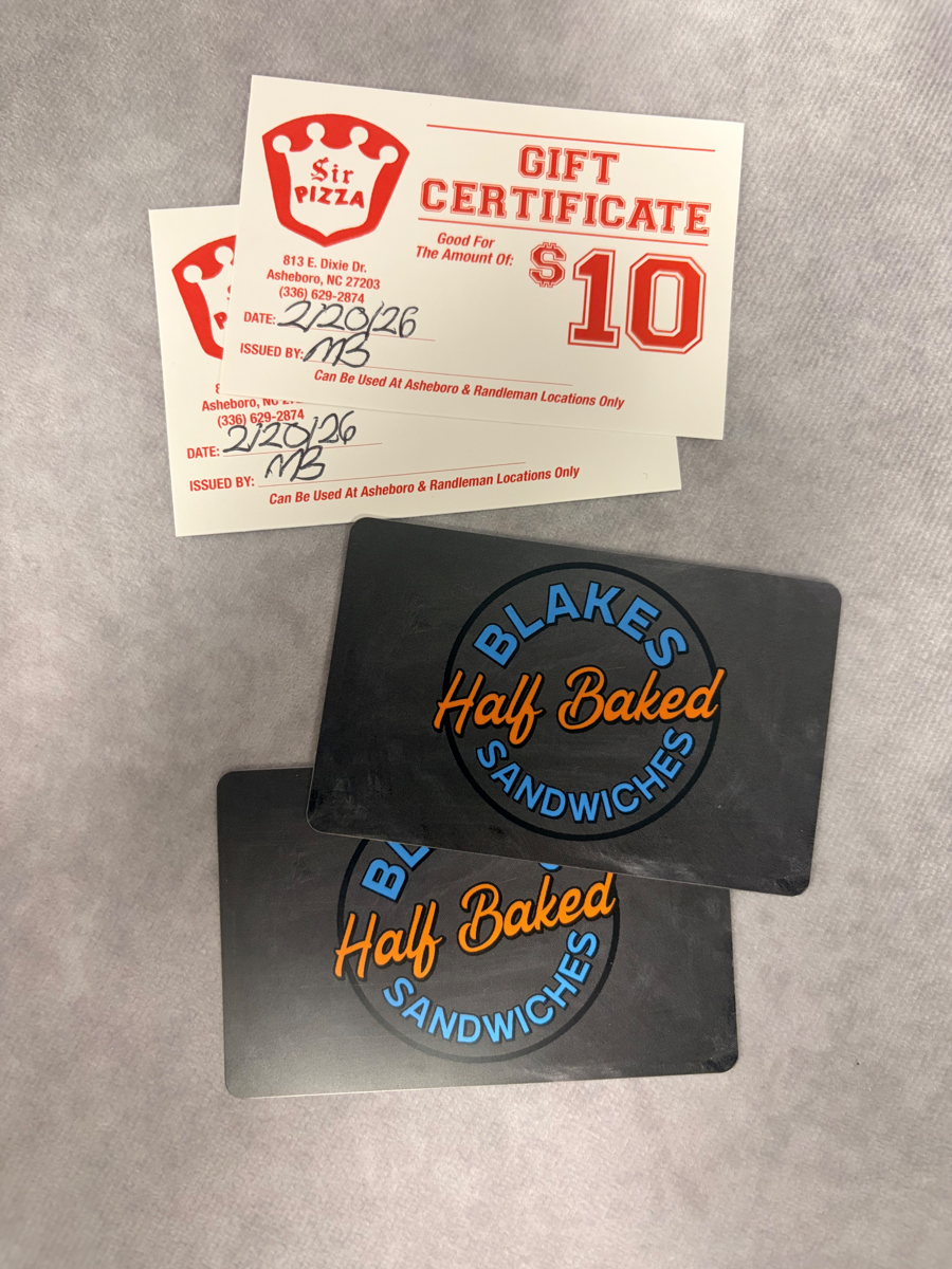 Two $10 GC's to Blakes 1/2 Baked Sandwich. Two $10 GC's to Sir Pizza Dixie Drive.