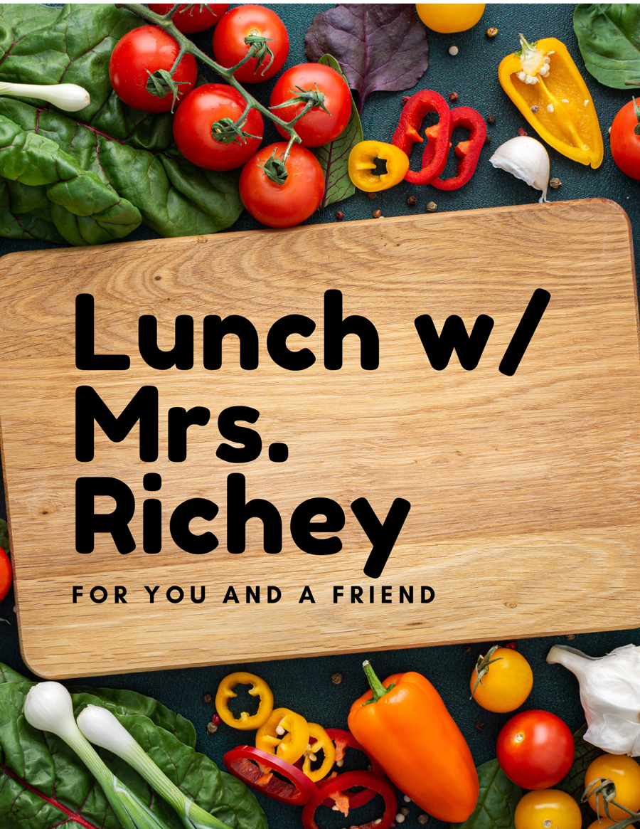 Bring a friend and enjoy a special lunch in the classroom with Mrs. Richey! Share conversation, laughs, and tasty food in a relaxed and personal setting. This is a wonderful chance to spend quality time with a favorite teacher and make an ordinary lunch break into a memorable experience!