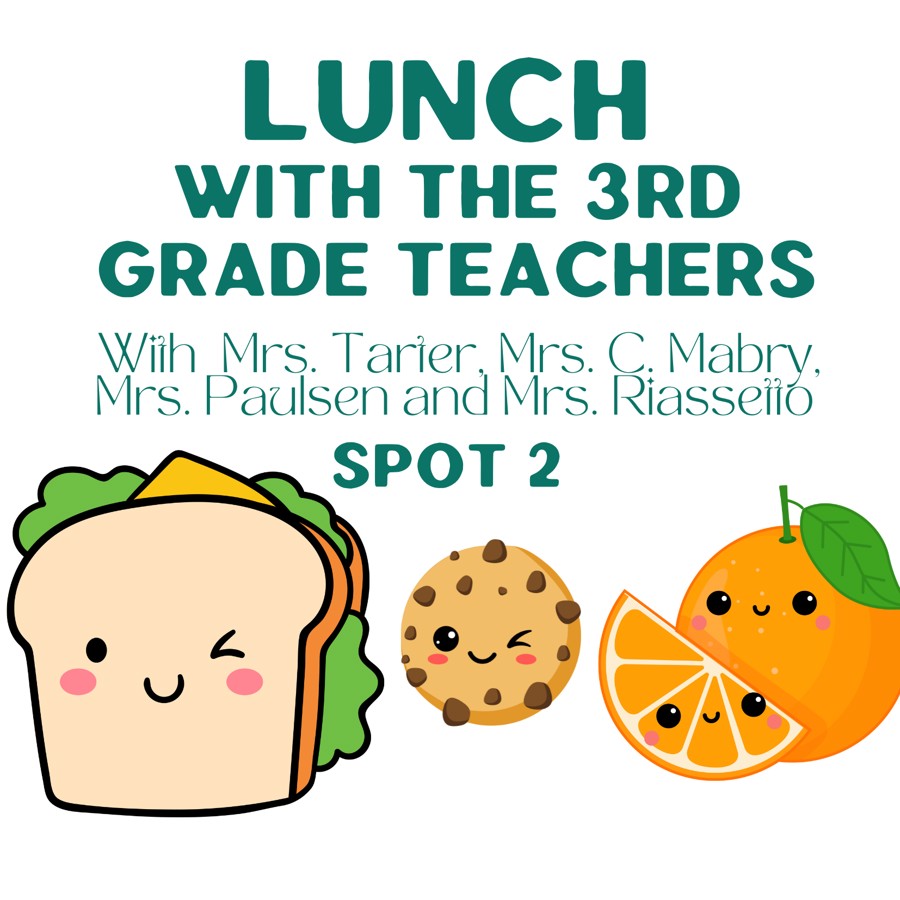 The winning bidder will join the 3rd Grade Teachers (Mrs. Tarter, Mrs. C. Mabry, Mrs. Riassetto and Mrs. Paulsen) for a special lunch! Lunch is provided, no need to bring one. This activity will take place on April 4, 2025 in Room 131. There are five (5) available spots for this activity, you are bidding on one of them.
